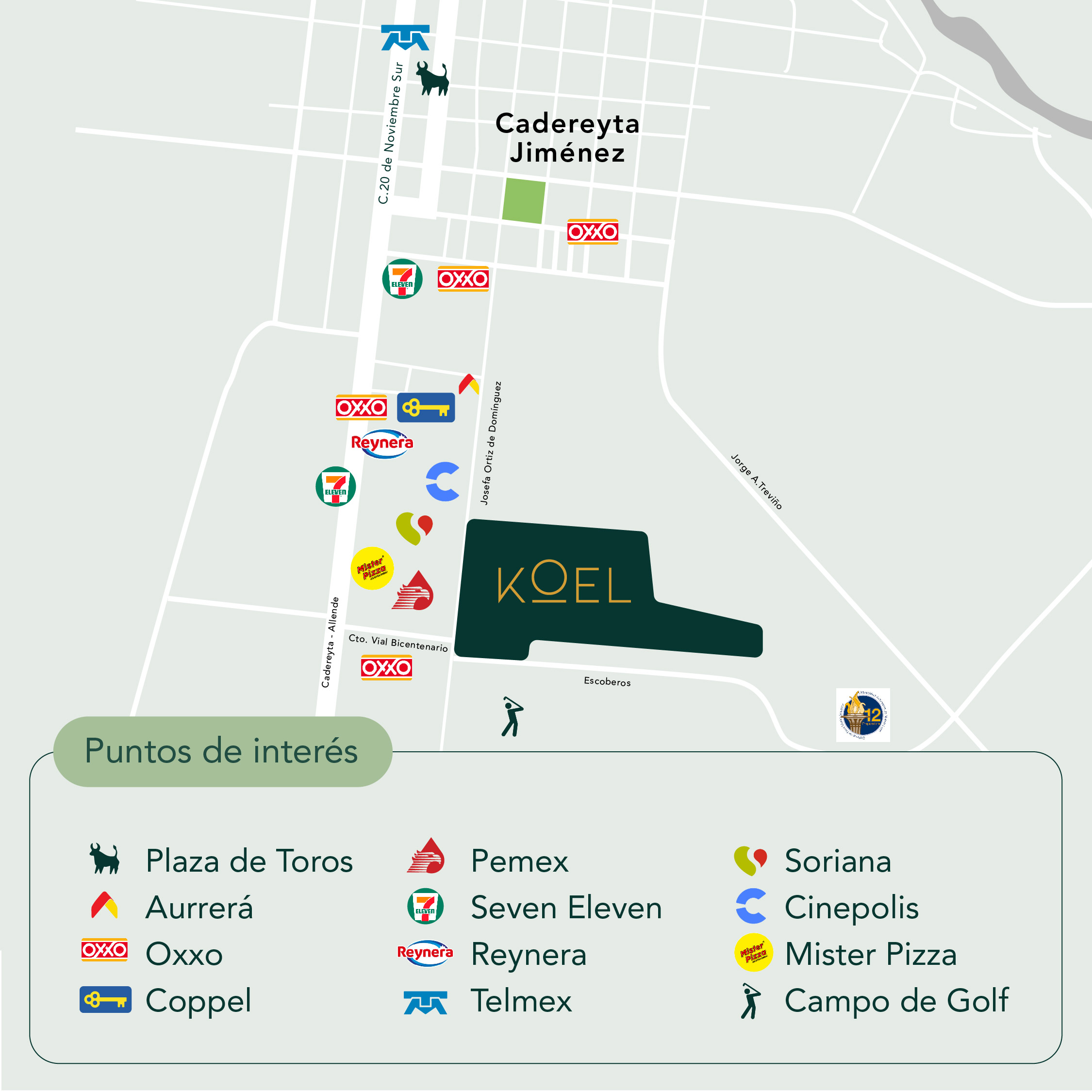 KOEL está ubicado en el municipio de Cadereyta Jiménez, Nuevo León, una zona con alta proyección de crecimiento y plusvalía. Su localización estratégica te brinda acceso rápido a escuelas, centros comerciales y vialidades principales. Nos encontramos en Calle Josefa Ortiz de Domínguez, esquina con Circuito Bicentenario